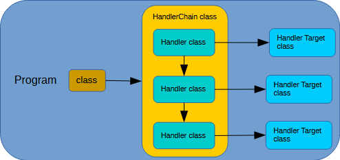 The Handler Chain or Chain of Responsibility is a very old pattern. A "chain" of handlers are built up. An object is passed to the head of the chain for handling. That first handler decides whether it can handle the object or not. if so, it handles it and returns. Otherwise, the handler passes the object to the next handler in the chain. This continues until no more handlers remain or a handler processes the object. The advantage of a chain like this is handlers can be inserted into or removed from the chain at runtime.