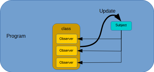 In this example of the Observer pattern, a Subject contains a numerical value that can change. There are three observers to the subject who are notified whenever the value changes. Each observer pulls the number from the Subject (for C++, C#, and Python) or is pushed the number (for C) and then displays the number in a different base. Typically these observers would run on different threads but in the interest of keeping things readable, everything runs on the same thread. The order of the output is dictated by the order of the observers subscribing to the Subject.